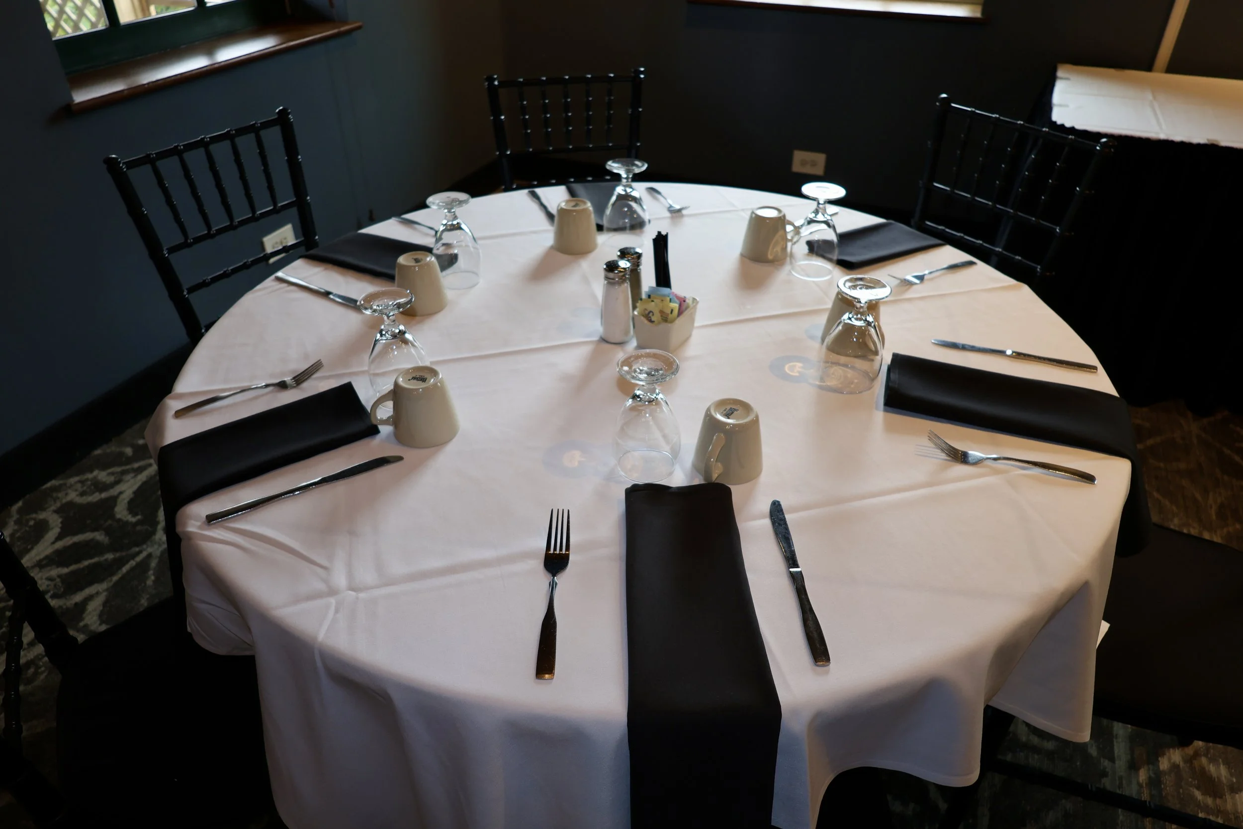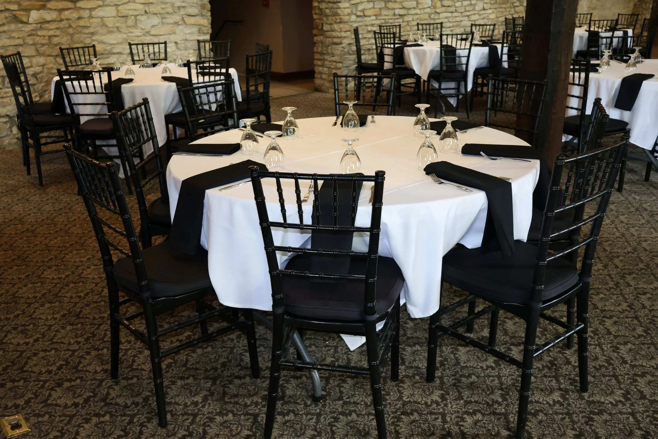 Tables white table linens, black napkins black chiavari chairs, glassware and silverware